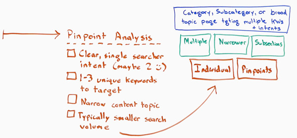 For pinpoint analysis, we kind of go the opposite direction. So we might look at a term like antique test tubes, which is a very specific kind of search, and that has a clear single searcher intent or maybe two. Someone might be looking for actually purchasing one of those, or they might be looking to research them and see what kinds there are. Not a ton of additional intents behind that. One to three unique keywords, yeah, probably. It's pretty specific. Antique test tubes, maybe 19th century test tubes, maybe old science test tubes, but you're talking about a limited set of keywords that you're targeting. It's a narrow content topic, typically smaller search volume.