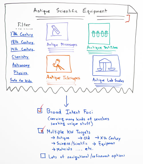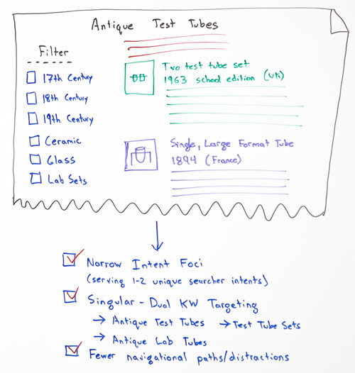This is narrower intent foci obviously, serving maybe one or two searcher intents. This is really talking about targeting maybe one to two separate keywords. So antique test tubes, maybe lab tubes or test tube sets, but not much beyond that.
