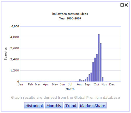 Don't take your cue from when the drugstore starts selling bags of Halloween candy--do some research and find out what last year's trends were so you're prepared this year. If you start early enough, you'll be basking in glorious search traffic while your competitors are scrambling with last minute link building campaigns three weeks before the holiday.
