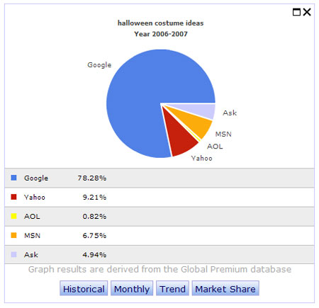 If you mouse over each bar, you'll see KWD's search count for the provided term during that time period (for example, the first September count shows 426 searches, then 741, then 917, then 2,085 as the month progresses). The chart can also be sorted by historical data (how many searches in the past year), monthly data (number of searches broken down into each month), trend (a graph of the search trends over the past year), combination (a graph of global vs. premium search data), and market share (a breakdown of which search engines were used to search for the query).