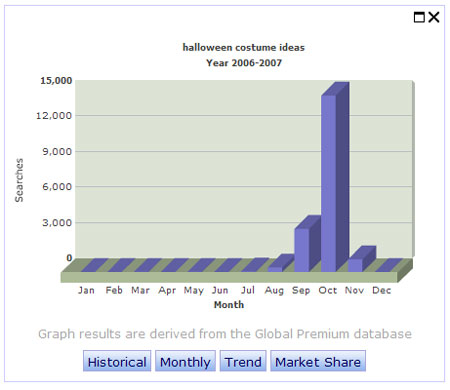 As you can see, searches start gaining traction towards the end of August and into the fall; thus, if you're doing SEO for Halloween-related terms, you would want to start building content and links towards the end of the summer so you're more visible to searchers when they think to start doing research.