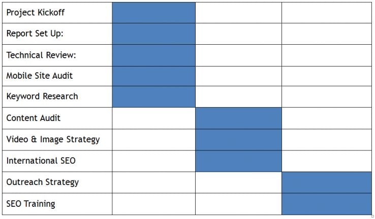 This plan is the response to those needs. We know we need to do keyword research, a technical audit, and Analytics implementation—how long will each take, approximately? Which will we do this month? Which have to wait for information from the client? We answer these to the best of our ability and that becomes our roadmap.