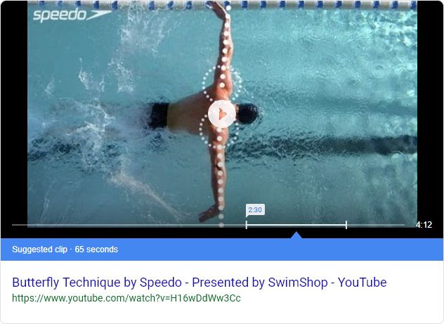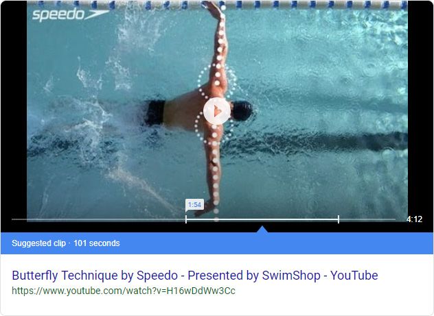 Note the "Suggested clip" highlighted in the blue box, and starting at the 2:30 mark. What's interesting is that variations on this search not only produce different videos in some cases, but different clips within the same video. Here's the result I got back for "how to swim the butterfly" (adding only the definite article "the"):
