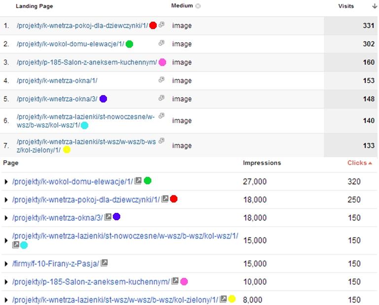 It is also worth noting that despite the large rounding up which is used by Google, the values shown in the Google Webmaster Tools are very similar to what you see in Google Analytics. Below there is a comparison of the most popular landing pages for images search traffic by Analytics and Google Webmaster Tools.