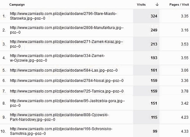 With that code modification, we have the access to many kinds of interesting information. First of all, we know what the amount of traffic is generated from images search. We can also compare the traffic by landing pages to determine the most popular photos and verify the quality of the traffic for individual landing pages and graphics.