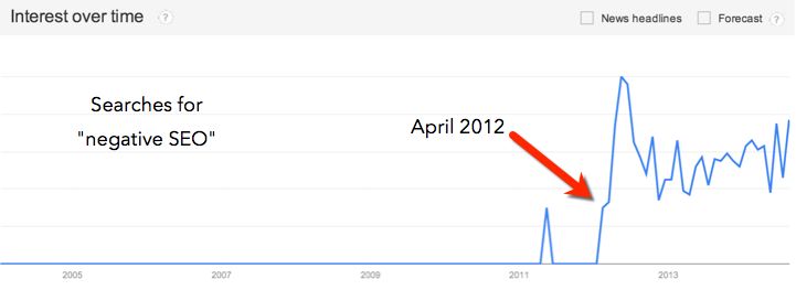 So, at that point Google is admitting that negative SEO via linkbuiding is a possibility, albeit quite a remote one. Let's jump forward to 2012. In April of 2012 Google released the first version of the Penguin algorithm which was created to reduce and even penalize for the use of unnatural links. This is when the topic of whether or not you could negatively affect a competitor's site by pointing bad links at them became a very common discussion. Take a look at the Google Trends data for searches for "negative SEO":