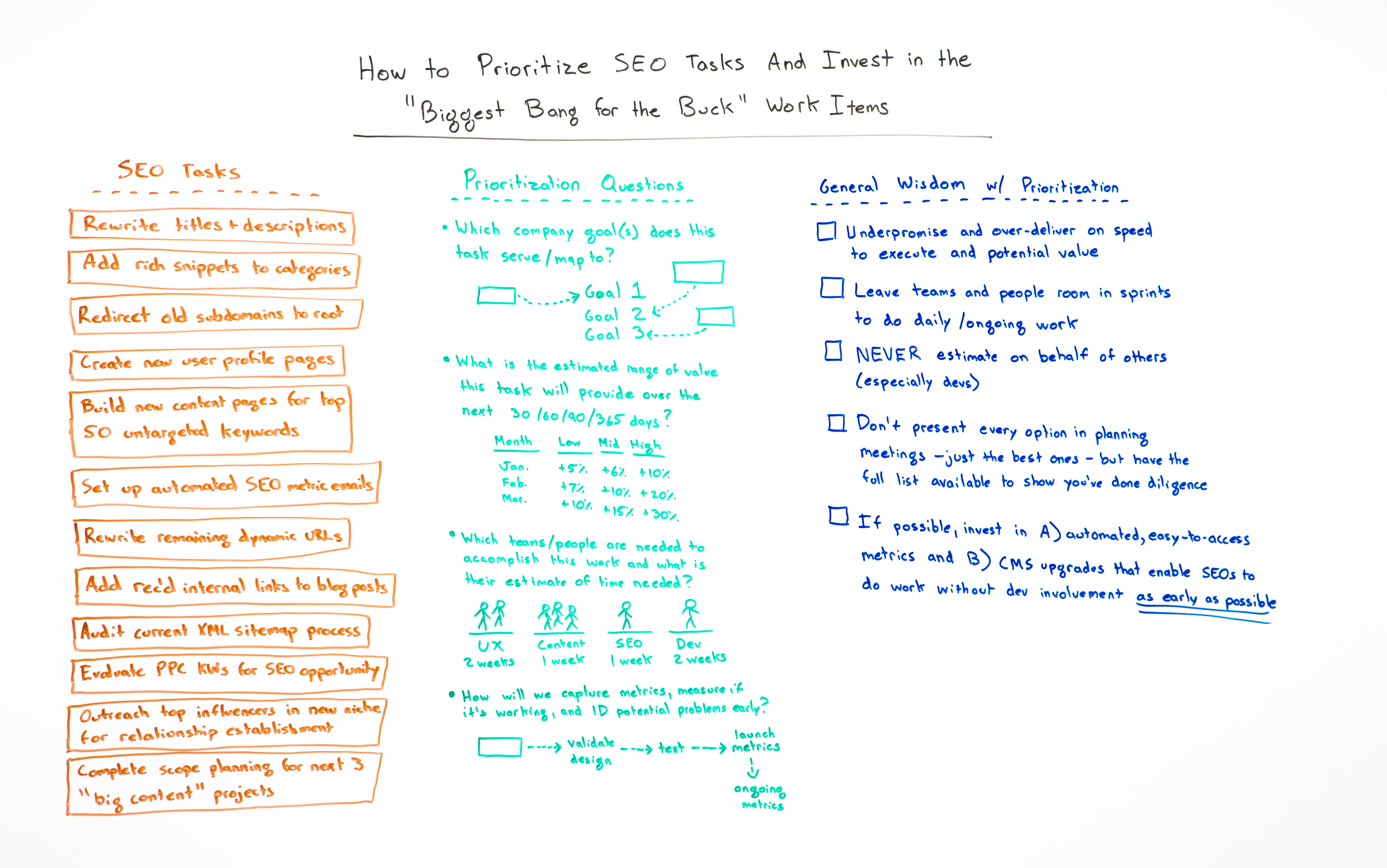 Look, the list of SEO tasks can be fairly enormous. It could be all sorts of things: rewrite our titles and descriptions, add rich snippets categories, create new user profile pages, rewrite the remaining dynamic URLs that we haven't taken care of yet, or add some of the recommended internal inks to the blog posts, or do outreach to some influencers that we know in this new space we're getting into. You might have a huge list of these things that are potential SEO items. I actually urge you to make this list internally for yourself, either as a consulting team or an in-house team, as big as you possibly can.