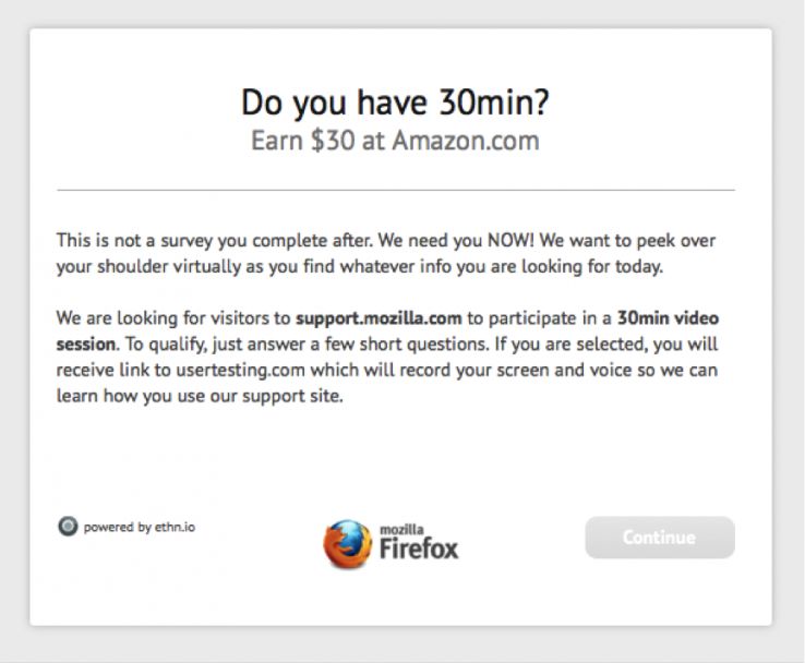 Ethn.io lets you recruit users for user testing and pre-qualify them. For example, in the above you can create a popup that looks something like this: