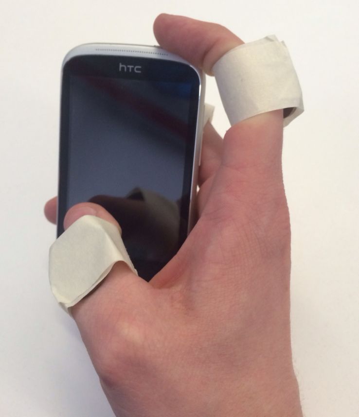 The image above is a picture of me with coins strapped to the back of my knuckles. This can be used to simulate the limited dexterity that can come as a result of arthritis.