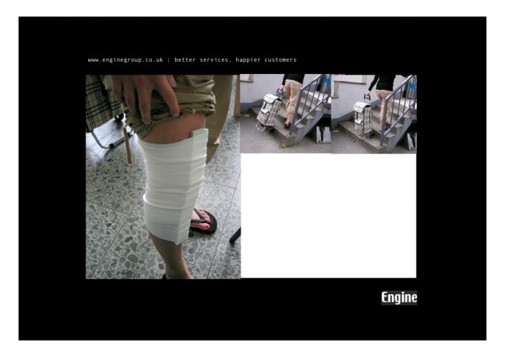The designers in the image above strapped up their legs using a kind of split. Again, this one done to simulate reduced mobility when trying to climb stairs.