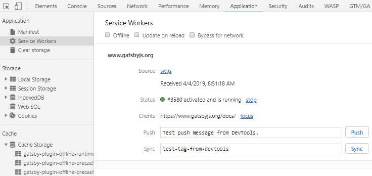 On the Application tab, you can see the service worker which is running on the current page along with the various caches it has created. You can disable or bypass the worker and test any of the more advanced functionality it might be using. Learning how to use these tools is an extremely valuable exercise; I won’t go into details here, but I’d recommend studying Google’s Web Fundamentals tutorial on debugging service workers.