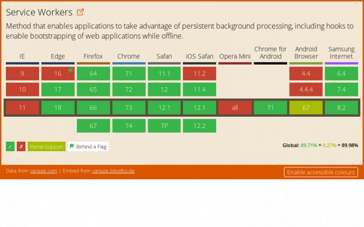 Ultimately, though, it is service workers which make the most exciting features of PWAs possible. They’re one of the most significant changes to the web platform in its history, and everyone whose job involves building, maintaining, or auditing a website needs to be aware of this powerful new set of technologies. If, like me, you’ve been eagerly checking Jake Archibald’s Is Service Worker Ready page for the last couple of years and watching as adoption by browser vendors has grown, you’ll know that the time to start building with service workers is now.