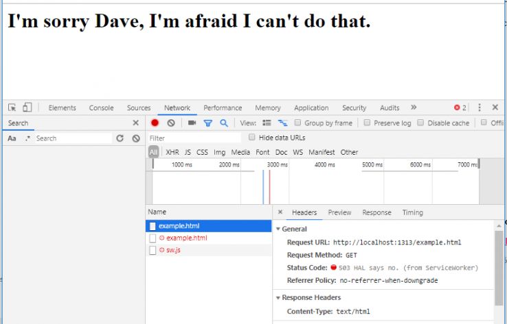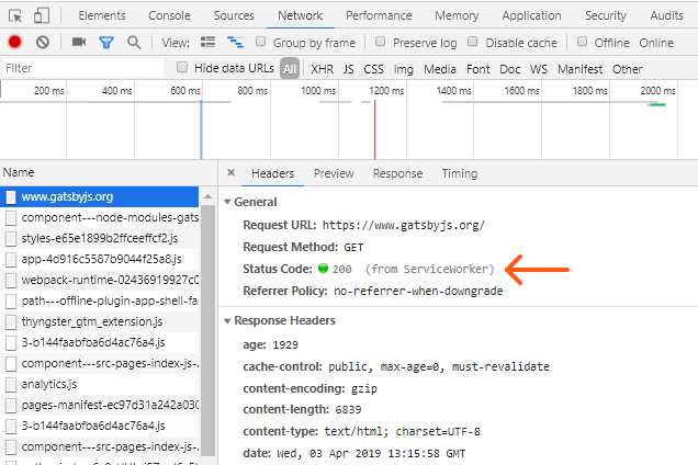 You can easily spot which responses came from the service worker using the Network tab — note the ‘from ServiceWorker’ line below.