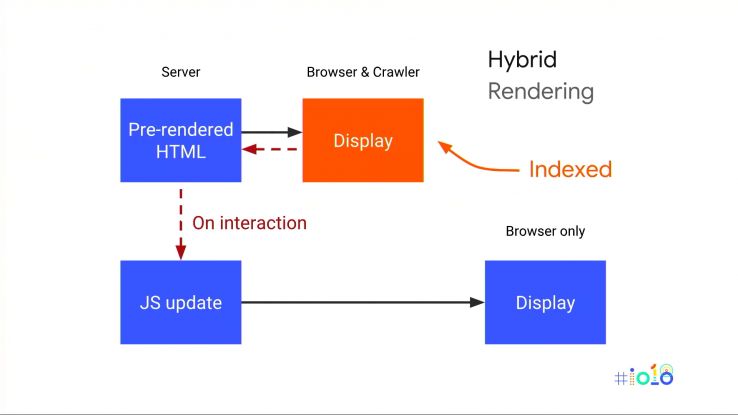 - Hybrid Rendering — This is Google’s long-term recommendation, and it’s absolutely the way to go for newer site builds. In short, everyone — bots and humans — get the initial view served as fully-rendered static HTML. Crawlers can continue to request URLs in this way and will get static content each time, while on normal browsers, JavaScript takes over after the initial page load. This is a great solution in theory, and comes with many other advantages for speed and usability too; more on that soon.