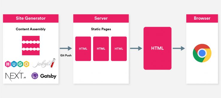 Think of it this way: everything lives in your Git repository. Your content is stored as plain text markdown files (editable via a headless CMS or other API-based solution) and your page templates and assembly logic are written in Go, JavaScript, Ruby, or whatever language your preferred site generator happens to use. Your site can be built into static HTML on any computer with the appropriate set of command line tools before it’s hosted anywhere. The resulting set of easily-cached static files can often be securely hosted on a CDN for next to nothing.