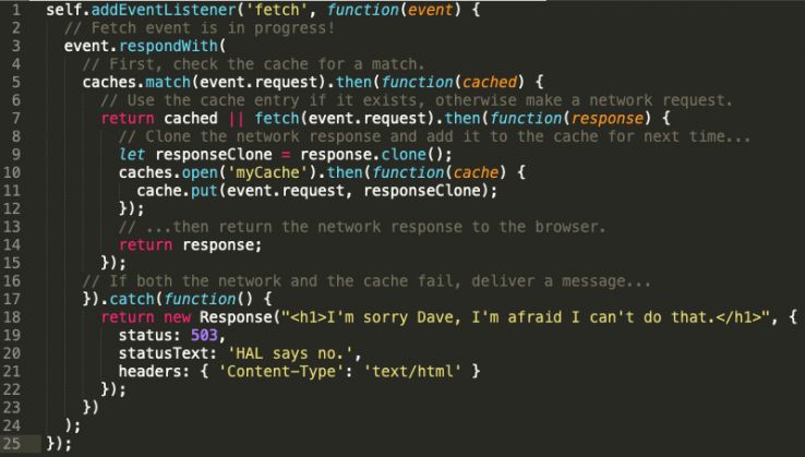 I’ve made a conscious effort to keep code snippets to a bare minimum in this article, but grant me this one. I’ve put together an example which illustrates how a simple service worker might use the Fetch API to handle requests and the degree of control which we’re afforded: