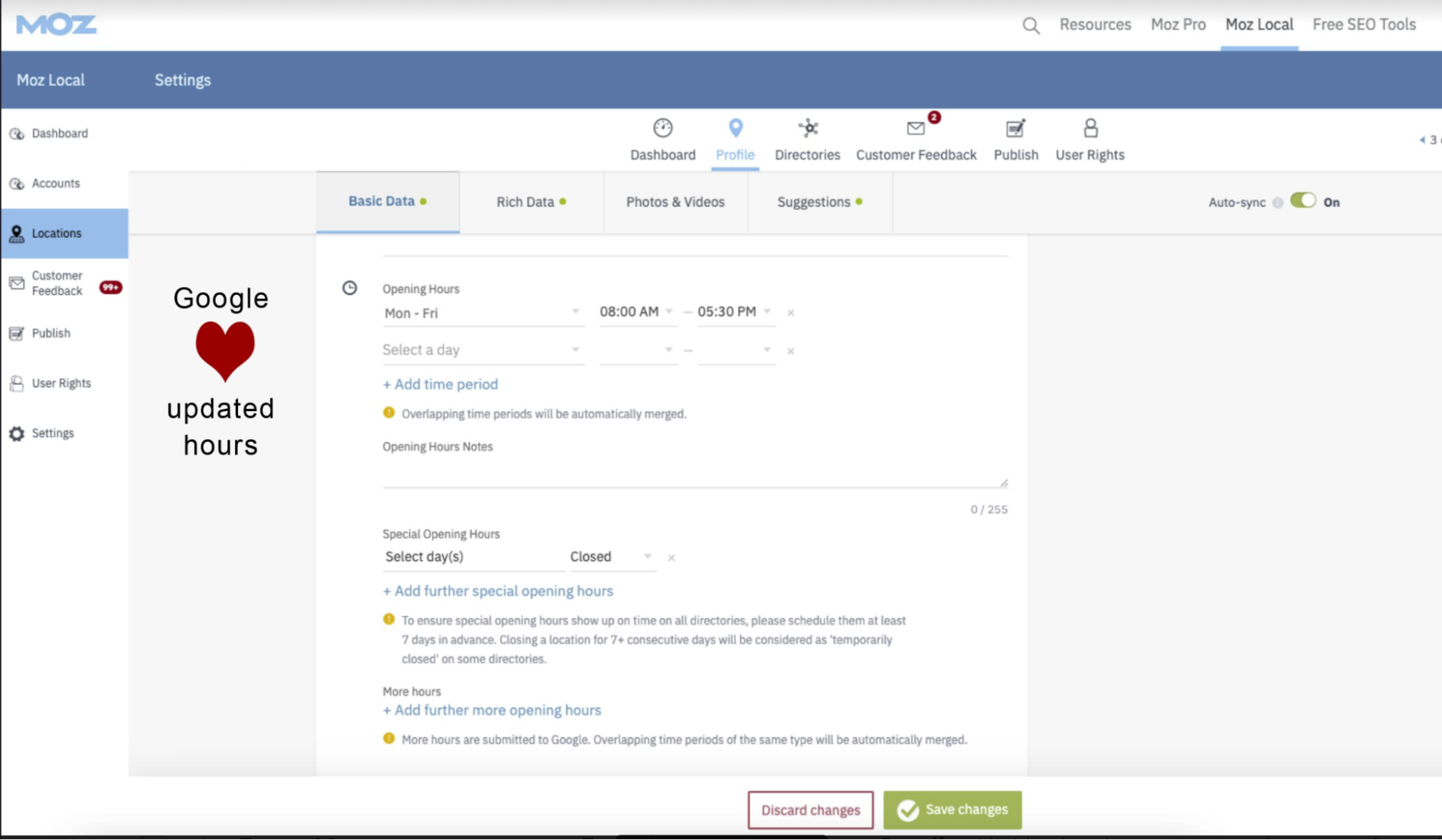 Sorry for the pain-in-the-neck, but if you manage your listings manually, you now need to regularly check all of them to see if Google has altered their hours. I’d recommend checking at least every month (as if you don’t already have enough to do). Moz Local customers have a much easier option. Just check the Profile Suggestions section of your dashboard to see, at a glance, whether Google or anyone else is trying to edit your hours, even if you have hundreds of listings. Being alerted when data changes are suggested should provide so much peace of mind, and you can accept or reject edit suggestions. Whew!