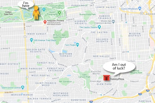 What do local SEOs mean when they speak of user-to-business proximity? Imagine an Internet searcher is standing in Golden Gate Park in San Francisco, looking on their phone, laptop or other device for “pizza”. Local SEOs observe that it’s more typical for Google to show that person Pasquale’s Pizzeria, right next to the park, than to show them Yummy Pizza across town in the Glen Park neighborhood.