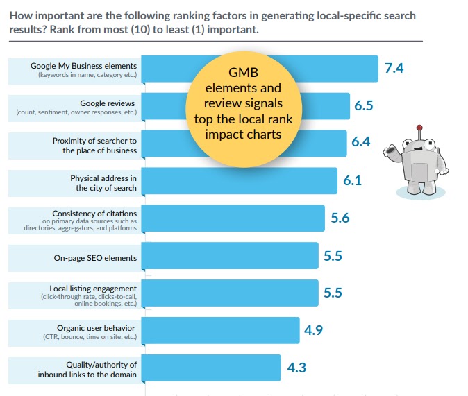Our large survey group of over 1,000 respondents ranked Google My Business elements (keywords in name, categories, etc.) and Google review elements (count, sentiment, owner responses, etc.) as having a greater influence on local pack rankings than does user-to-business proximity.