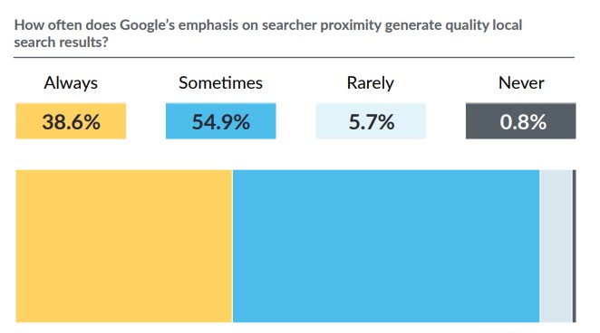 Proximity can be problematic. In a separate question in our survey in which we asked whether Google’s emphasis on proximity was always generating high quality results, only 38.6% of respondents felt satisfied. Most of us are frequently encountering local pack results that may be closest, but not best. This can leave agencies and business owners feeling a bit dubious about Google and even a bit helpless about acting in an environment that often ranks mere nearness over quality.