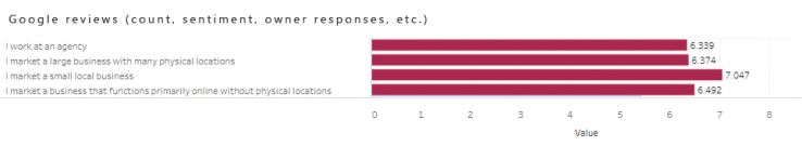 Overall, Google review elements rank second, and within this statistic, it’s survey takers who market one small local business who rate the influence of reviews most highly, on average. These would presumably be independent business owners or their in-house marketing staff who are regularly eyeing the local packs to see what seems to move the needle.