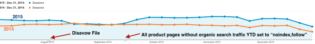 By temporarily pruning out 80% of the catalog from search engine indexes and cleaning up their link profile, we saw an impressive multi-month lift in traffic and revenue from search followed by a course on-par with last year — despite having fewer indexed pages.