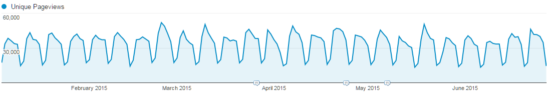 Let's get the high-level overview before we dive into details. Traffic on the Moz Blog can obviously vary quite a bit depending on the content, but all things considered, it's remarkably steady. Here are total daily unique pageviews to all pages on the blog so far in 2015: