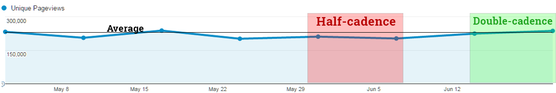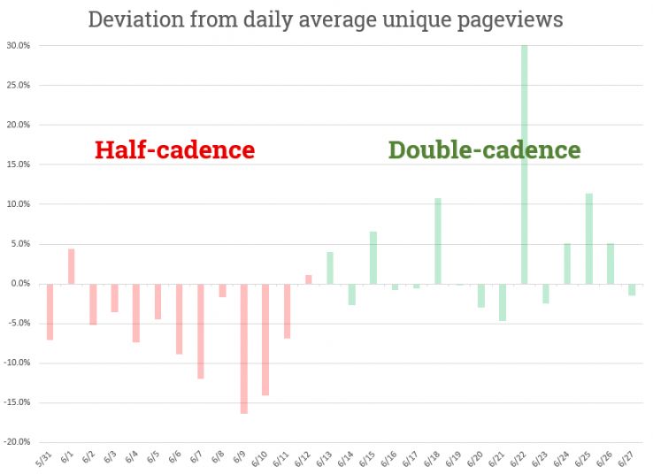 This is a more noteworthy difference. Dropping the publishing volume to half our normal cadence resulted in, on average, a 5.6% drop in unique pageviews from those daily averages.