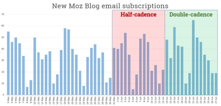 The experiments were simple: Set a benchmark of two "normal" weeks, then adjust the publishing volumes on each blog to (roughly) half the normal cadence for two weeks and double the normal cadence for two weeks.