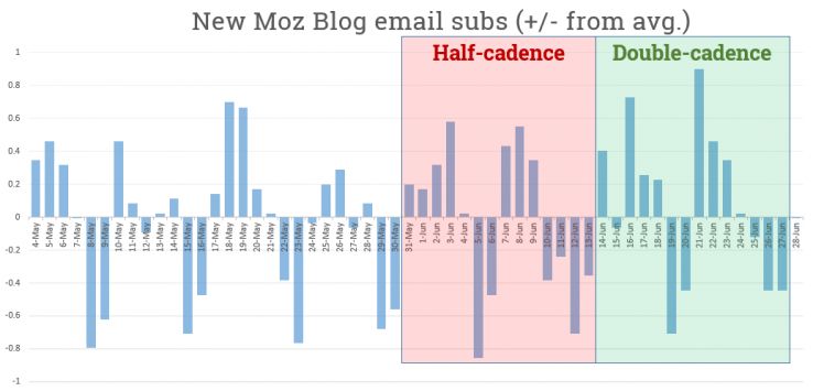 One important note is that we don't send multiple emails each day, so during the double-cadence period we were sending daily digests of multiple posts. (Were we to send more than one each day, we might have expected a significant rise in unsubscribes. That's something HubSpot was better able to track in their version of this experiment.)