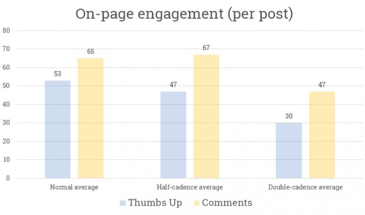 The number of thumbs up and comments stayed relatively level during the half-cadence period, and fell sharply when there were twice as many posts as usual.