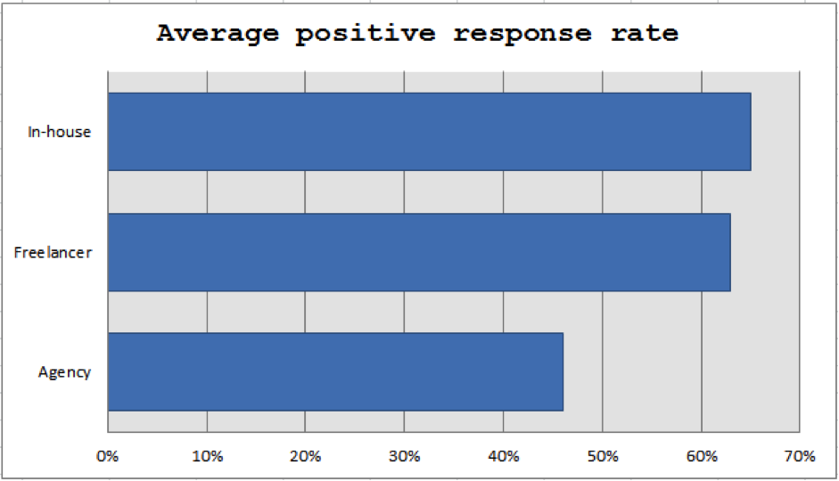 In cases where the partner was approached by a freelancer, a positive response was received 189 times. In cases where the partner was approached by an in-house employee, a positive response was received 78 times and finally in cases where the partner was approached by an agency employee, we received positive responses 170 times.
