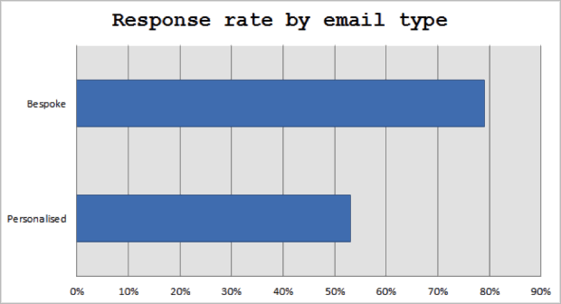 We make a note of whether the email sent was tailored or entirely bespoke and the results align with what you might expect…