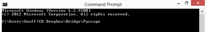 - Next you'll need to change the directory that the application is operating in to the directory where you have extracted Pyscape. "Enter "CD" followed by the folder path leading to the extracted Pyscape directory and hit enter.