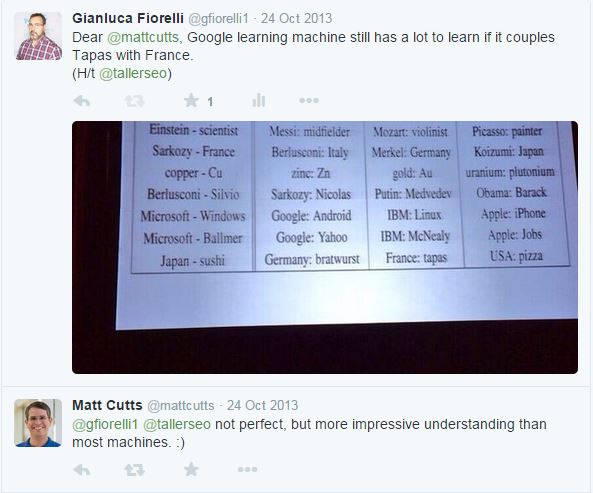 Vectors, though, don't seem to be a completely new feature in the general Hummingbird algorithm. We have evidence of a very similar thing in 2013 via Matt Cutts himself, as you can see from the Twitter conversation below: