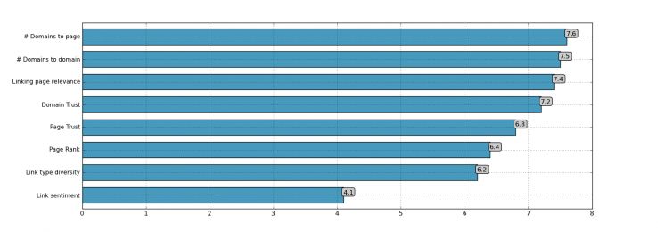 The survey asked respondents to rate many different factors on a scale of 1-10 according to how important they thought they were in Google's ranking algorithm. We present the average score across all responses. The highest-rated factors in our survey had average scores of 7-8 with less-important factors generally ranging from 4-6.