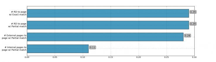 The anchor text correlations are one of the most significant differences between our results and the Searchmetrics study. We aren't sure exactly why this is the case, but suspect it is because we included navigational queries while Searchmetrics removed them from its data. Many navigational queries are branded, and will organically have a lot of anchor text matching branded search terms, so this may account for the difference.