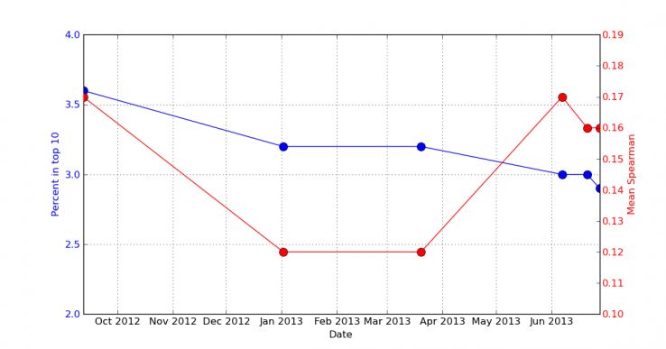 However, we see a see-saw pattern in the EMD correlations (red line) where they decreased last fall, then rose back again in the last few months. We attribute the decrease last fall to Google's EMD update (as announced by Matt Cutts). The increase in correlations between March and June says that the EMDs that are still present are ranking higher overall in the SERPs, even though they are less prevalent. Could this be Google removing lower quality EMDs?