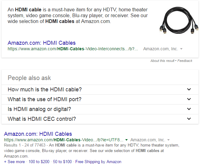 Here's the top portion of a SERP for "hdmi cable," a commercial query: