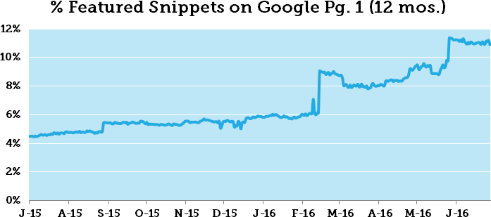 In our 10,000-keyword tracking data set, Featured Snippets rolled out at approximately 2% of the queries we track. As of mid-July, they appear on roughly 11% of the keywords we monitor. We don't have good historical data from the first few months after roll-out, but here's a 12-month graph (July 2015 – July 2016):