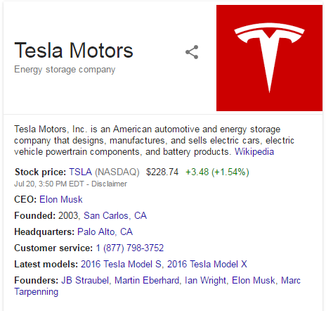 The answer is short and factual, and there is no corresponding source link for it. This comes directly from the curated Knowledge Graph. If you run a search for "Tesla," you can see this more easily in the Knowledge Panel on that page: