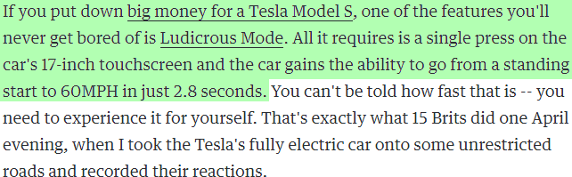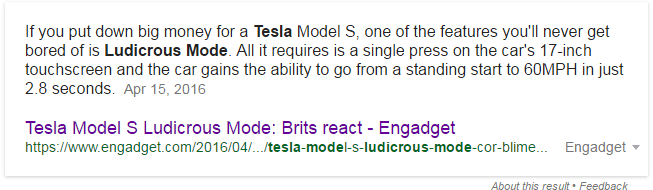 While Google does a decent job of matching many forms of a question to answers in the Knowledge Graph, they can't escape the limits of human curation. There are also questions that don't easily fit the "factoid" model. For example, if you search "What is ludicrous mode Tesla?" (pardon the weird syntax), you get this Featured Snippet: