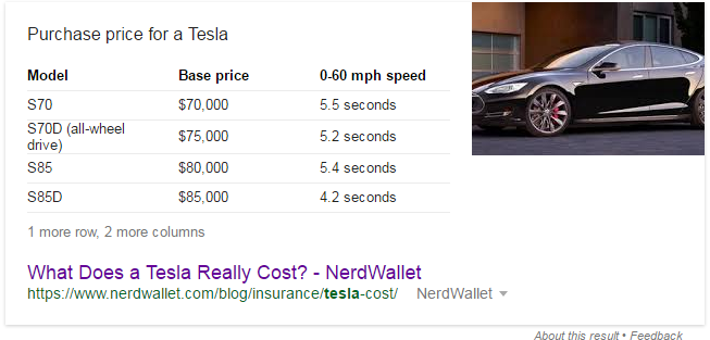 It's not as simple as just scraping off the first paragraph with a spatula and flipping it onto the SERP, though. Google does seem to be parsing content fairly deeply for relevance, and they've been improving their capabilities constantly since the launch of Featured Snippets. Consider a couple of other examples with slightly different formats. Here's a Featured Snippet for "How much is a Tesla?":