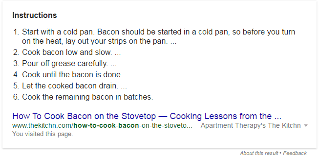 Here's one of my favorite examples, from a search for "how to cook bacon." For any aspiring bacon wizards, please pay careful attention to step #4: