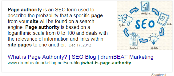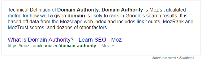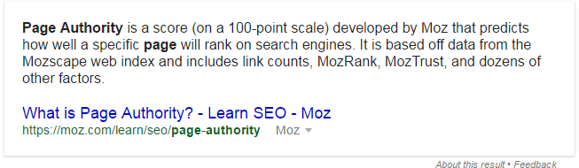 A while back, I did a search for "What is Page Authority?" Page Authority is a metric created by us here at Moz, and so naturally we have a vested interest in who's ranking for that term. I came across the following Featured Snippet.