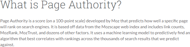 "According to Moz, Page Authority is a score developed by Moz that predicts how well a specific page will rank on search engines."