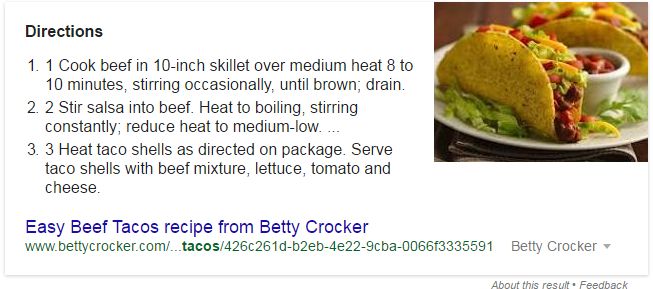 Likewise, "How...?" questions often require more in-depth answers. An especially good target for Featured Snippets is "How to... ?" questions, which tend to have practical answers that can be summarized. Here's one for "How to make tacos":