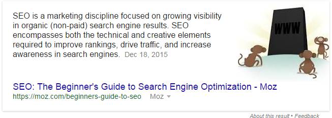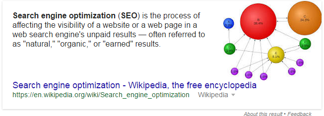 Once you have a question in mind, and that question/query is eligible for Featured Snippets, there's another piece of the targeting problem: which page on your site is best equipped to answer that question? Let's take, for example, the search "What is SEO?". It has the following Featured Snippet from Wikipedia: