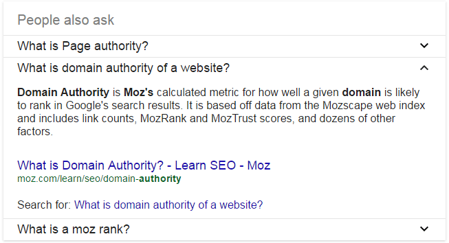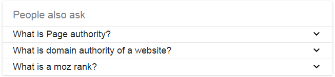 Featured Snippets have a close cousin that launched more recently, known to Google as Related Questions and sometimes called the "People Also Ask" box. If I run a search for "page authority," it returns the following set of Related Questions (nestled into the organic results):
