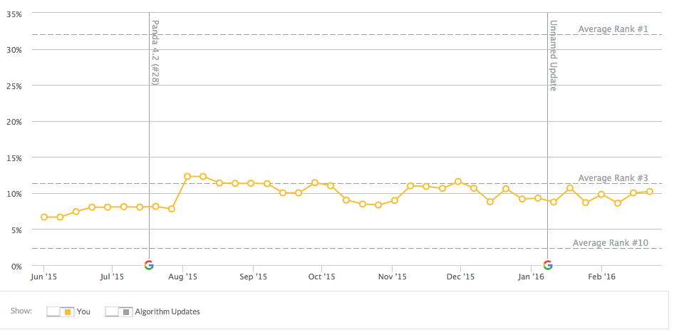 In the screenshot above, you can observe the correlation between Google’s July 17 Panda update and a significant improvement in my Search Visibility. Correlation doesn’t imply causation, of course, but the overlay is a useful tool to add context to your SEO efforts. It may help you differentiate between changes you’ve made in your optimization and marketing efforts and changes Google has made to its algorithm.
